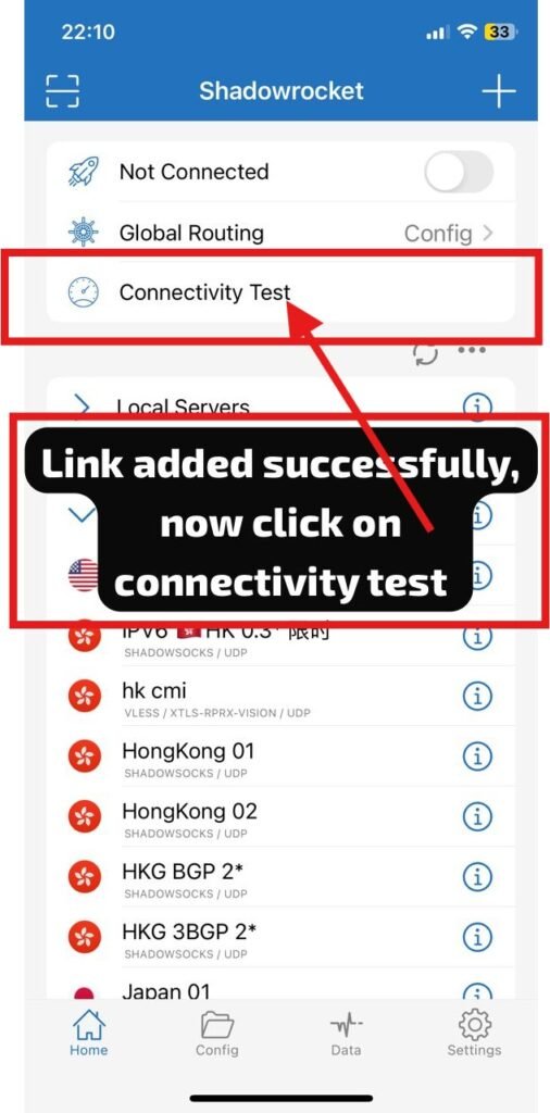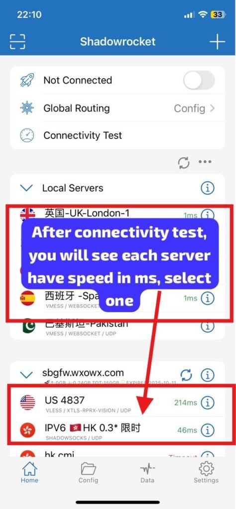 - After saving subscription link, click on connectivity test and you will see numbers in ms on each server, select any.
